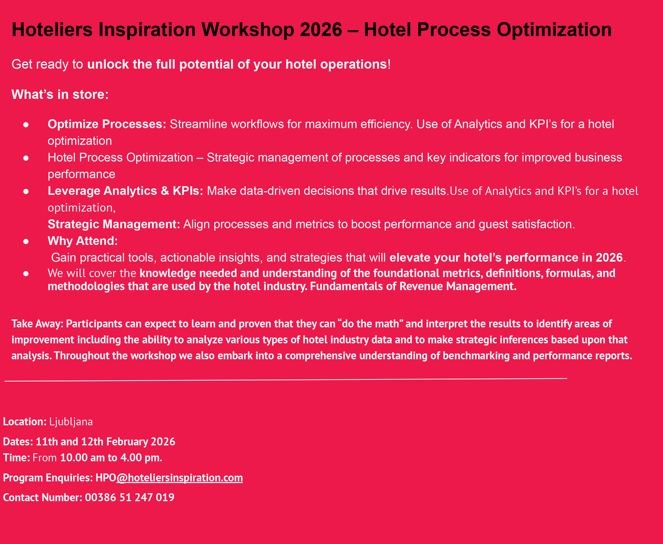 If you are interested in the workshop, please write to HPO@hoteliersinspirations.com, and we will send you more information.